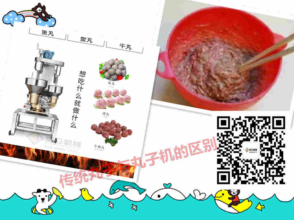 火锅丸子机主要用于鸡肉丸,鱼丸,虾丸,猪肉丸,牛肉丸,羊肉丸,蔬菜丸等各种丸子的加工。肉丸生产线的主要设备有绞肉机,刨肉机,抖馅机,肉丸机,成型水槽,油炸生产设备等。火锅丸子机是制作肉丸中的多用途设备。